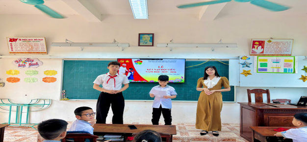 Tại lễ kết nạp đội viên tất cả các em học sinh tiêu biểu của khối lớp 3 chính thức được Thầy Tổng phụ trách và các thầy cô chủ nhiệm khối lớp 3 đặt những chiếc khăn quàng đỏ – một phần của lá cờ Tổ quốc, niềm tự hào về đội viên Đội TNTP Hồ Chí Minh, tự hào về Tổ quốc lên vai.